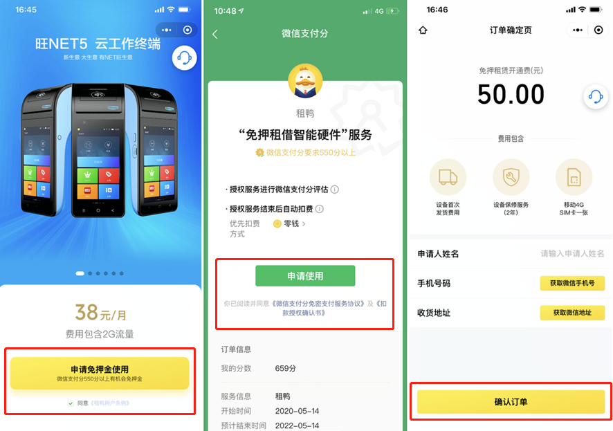 微信POS機信用免押系統是我們在2020年全新推出的一款提供免押租借智能硬件服務的系統。只要用戶的支付分在550分及以上,就可以通過微信進行線上租賃。